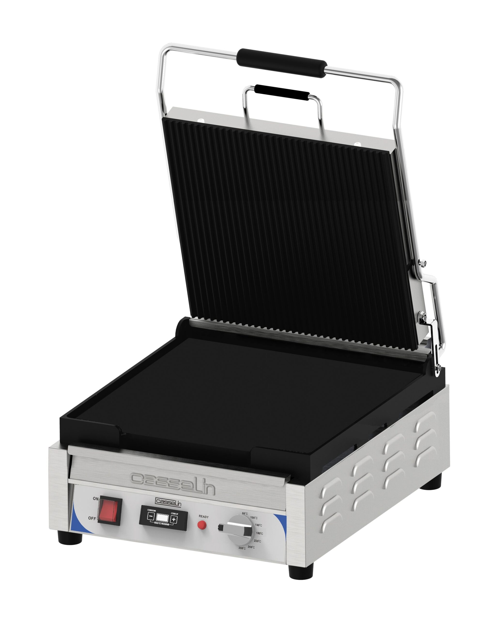 – Rustfrit stål – Justerbar termostat fra 60 °C til 300 °C – Sikkerhedstermostat – Batteritimer (2 “AAA” batterier – LR03 medfølger ikke) – Fedtdrypbakke – Øvre rillet grillplade: B 360 x D 360 mm – Nederste glat grillplade: B 360 x D 360 mm – Effekt: 2